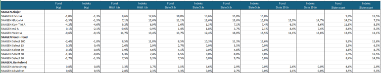 Det nordisk-globale aksjefondet SKAGEN Vekst falt 0,6 prosent i mai, mens indeksen falt 0,1 prosent. Se flere avkastningstall nederst i artikkelen.