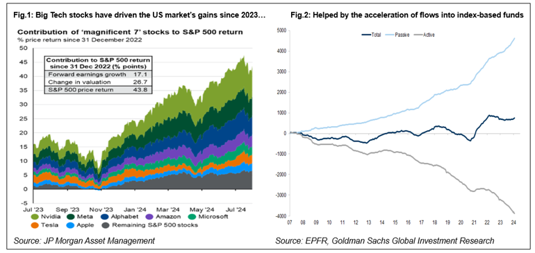 Resultatet är en marknad som har blivit alltmer koncentrerad, vilket skapar utmaningar för aktiva förvaltare och ökar koncentrationsrisken för passiva investerare.