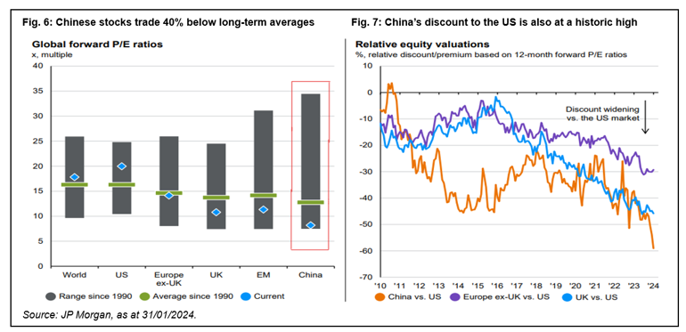 2023 var särskilt besvikande för investerare i Kina, med aktier som tyngdes av geopolitiska spänningar och ett sammanbrott i fastighetsmarknaden medan landet kämpade för att återhämta sig efter COVID-19. Med att MSCI China-indexet har förlorat över en tredjedel av sitt värde de senaste tre åren, är nu värderingen av kinesiska aktier på sin lägsta nivå sedan 1990-talet (fig. 6), och de handlas nu med en rekordrabatt på 60 % jämfört med amerikanska aktier (fig. 7).