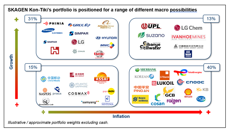 Mot dessa utmaningar fortsätter SKAGEN Kon-Tiki att prestera starkt, med solid absolut avkastning och en ledning över EM-indexet med över 3 procentenheter[2] hittills i år. Detta är särskilt imponerande med tanke på att portföljen är underviktad i de bästa marknaderna som Taiwan (+17,0 procent) och Indien (+8,2 procent). Ungefär en fjärdedel av tillgångarna är investerade i den relativt svaga kinesiska marknaden (-12,9 procent) [3].